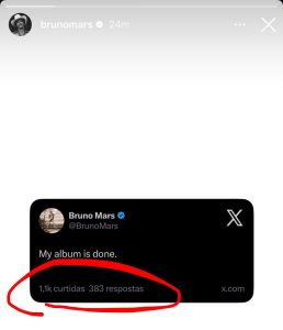 Além da novidade ter animado os fãs, um detalhe especial chamou a atenção dos brasileiros: ao compartilhar o tweet nos stories do Instagram, é possível ver que as configurações do celular de Bruno Mars estão em português.