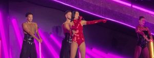 Com o pop divertido e suave de “End of an Era”, Dua Lipa fez com que o público flutuasse da mesma forma que ela fez no palco em meio às plumas usadas por seus dançarinos. Com uma transição quase que imperceptível, “Break My Heart” ressaltou a potência vocal da cantora, contagiando o público com seu refrão dançante e uma pequena pausa dramática antes do final da performance, que foi acompanhada por uma chuva de corações de papel. Em meio à batida mais oitentista que marca um dos maiores hits do álbum “Future Nostalgia” (2020), o Estádio MorumBIS foi transformado em uma pequena balada com a apresentação de “One Kiss”, parceria de Dua Lipa com Calvin Harris, que foi cantada a todo pulmão pelo público.