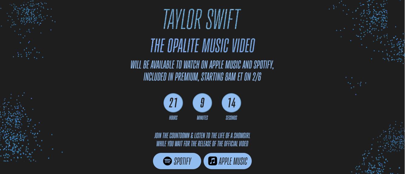 Apesar de Taylor estar um pouco ausente das redes sociais após o fim de seu documentário “The End of an Era”, a notícia foi divulgada no site oficial da cantora, que traz um cronômetro marcando a contagem regressiva para a divulgação do clipe. Além disso, o site também mostra um link para a pré-venda do vinil de “Opalite”, que inclui uma versão acústica da faixa.